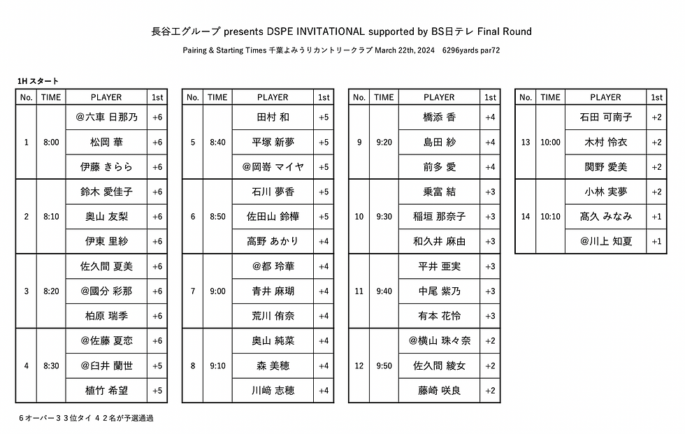 大会最終日のペアリングを掲載しましたDSPE INVITATIONAL事務局2024年3月21日読了時間: 1分3月22日(金)に開催する 長谷工グループpresents DSPE INVITATIONAL supported by BS日テレ 本戦最終日のペアリングです。